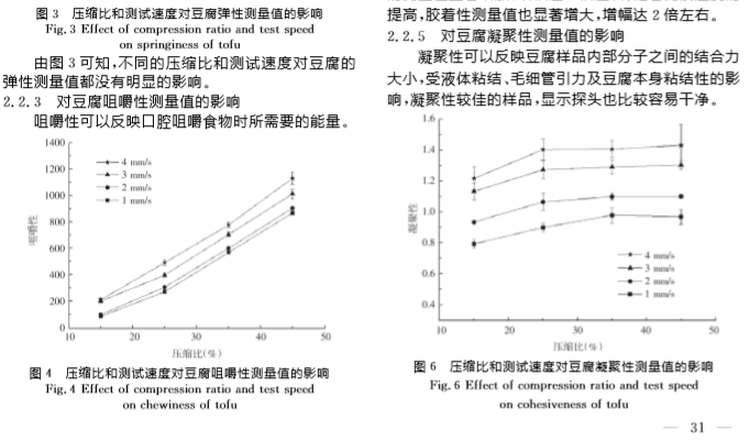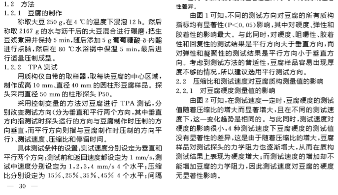 摘要:豆腐的质构是衡量豆腐品质的重要指标,该研究探究了豆腐TPA测试中测试方向、压缩比、测试速度和停顿时间对豆腐TPA测试值的影响,并进行测试条件的优化。结果表明:测试方向、压缩比和测试速度对测试结果有显著性影响,其中平行方向测得的硬度、咀嚼性、胶着性和回复性高于垂直方向;随着压缩比增大,硬度、咀嚼性、胶着性显著增大,回复性降低;随着测试速度的增大,咀嚼性、胶着性、凝聚性、回复性增大;停顿时间的变化对测试结果基本上没有显著性影响,只对弹性和凝聚性有影响。对测试条件进行初步优化,建议的测试条件是:平行测试方向,压缩比为40%,测试速度为2mm/s,停顿时间为2s。