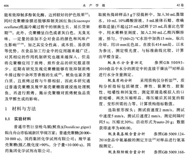 摘要 :为减少煎烤鱿鱼在制作过程中的营养损失和 甲醛的生成。实验采用2g/L的壳聚糖 溶液( 普通壳聚糖和羧甲基壳聚糖) 浸泡处理新鲜 巨型枪乌贼( 秘鲁鱿鱼) 5mi n,再进行高 温煎烤。甲醛检测的结果显示,煎烤后对照组( 纯水浸泡) 、壳聚糖组、羧甲基壳聚糖组 鱿鱼中的甲醛含量分别为45.56、4.79、8.3 0mg/kg,各组之间差异极显著。煎烤前后鱿鱼 中几种营养素的检测结果显示,壳聚糖组中天冬氨酸、丝氨酸、脯氨酸、胱氨酸、赖氨 酸、十二酸、十五酸、十七酸、十八碳烯酸( n =9 ) 、十八碳烯酸( n =6 ) 、亚油酸( n =6 ) 、二 十碳烯酸( n =9 ) 、二十碳二烯酸、二十碳 四烯酸、二十碳五烯酸( EPA) 、二十二碳五烯酸 ( n =3 ) 及元素Mg、P、Mn和维生素C含量高于对照组,其他营养素含量较对照组低。羧 甲 基壳聚糖组中天冬氨酸、丝氨酸、甲硫氨酸、亮氨酸、赖氨酸、组氨酸、十四碳烯酸、十五酸、十六碳烯酸( n =7 ) 、十七酸、花生烯酸( n=9) 、二十碳二烯酸、二十碳四烯酸、二十碳五烯 酸( EPA) 及 元素K、Mg、P、Zn、Mn、Se和 维生素B含 量高于对 照组 ,其他 营 养素含量较对照组低。另外,EPA及7种人体必需氨基酸在壳聚糖组的含量高于羧 甲基 壳聚糖组。研究表 明,2种壳聚糖均能有效抑制鱿鱼在煎烤过程中甲醛的生成,普通壳 聚糖效果更显著,并且能较好地保持鱿鱼的品质。