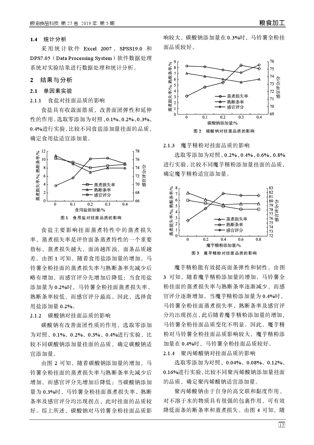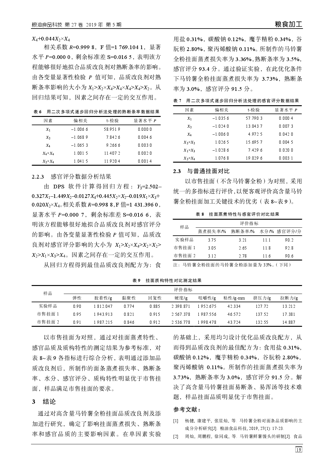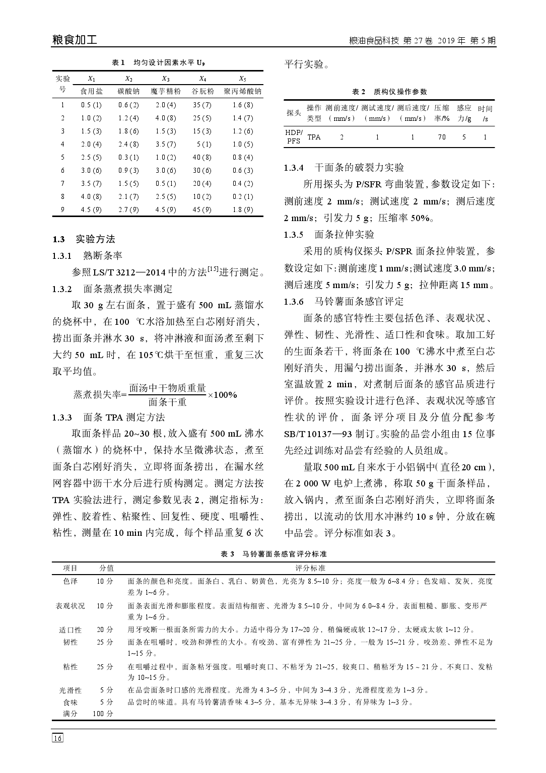 摘 要:利用均匀设计优化高含量马铃薯(全粉含量 33%)挂面的品质改良,通过回归分析确定其品 质的主要影响因素,以熟断条率、蒸煮损失、感官评分为考察指标进行实验。结果表明:品质改良剂 为食用盐 0.31%,碳酸钠 0.12%,魔芋精粉 0.34%,谷朊粉 2.80%,聚丙烯酸钠 0.11%时,得到的挂面 蒸煮损失率为 3.73%,熟断条率为 3.0%,感官评分 91.5 分。通过对品质改良剂的研究,解决了高含量 马铃薯挂面易断条、易浑汤等技术难题,使样品品质明显优于市售挂面。