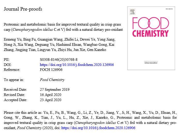 2020年4月23日,食品期刊《Food Chemistry》(IF=5.399)在线发表了中国水产科学研究院珠江水产研究所研究团队题为“Proteomic and metabolomic basis for improved textural quality in crisp grass carp (Ctenopharyngodon idellus C.et V) fed with a natural dietary pro-oxidant”的研究论文。