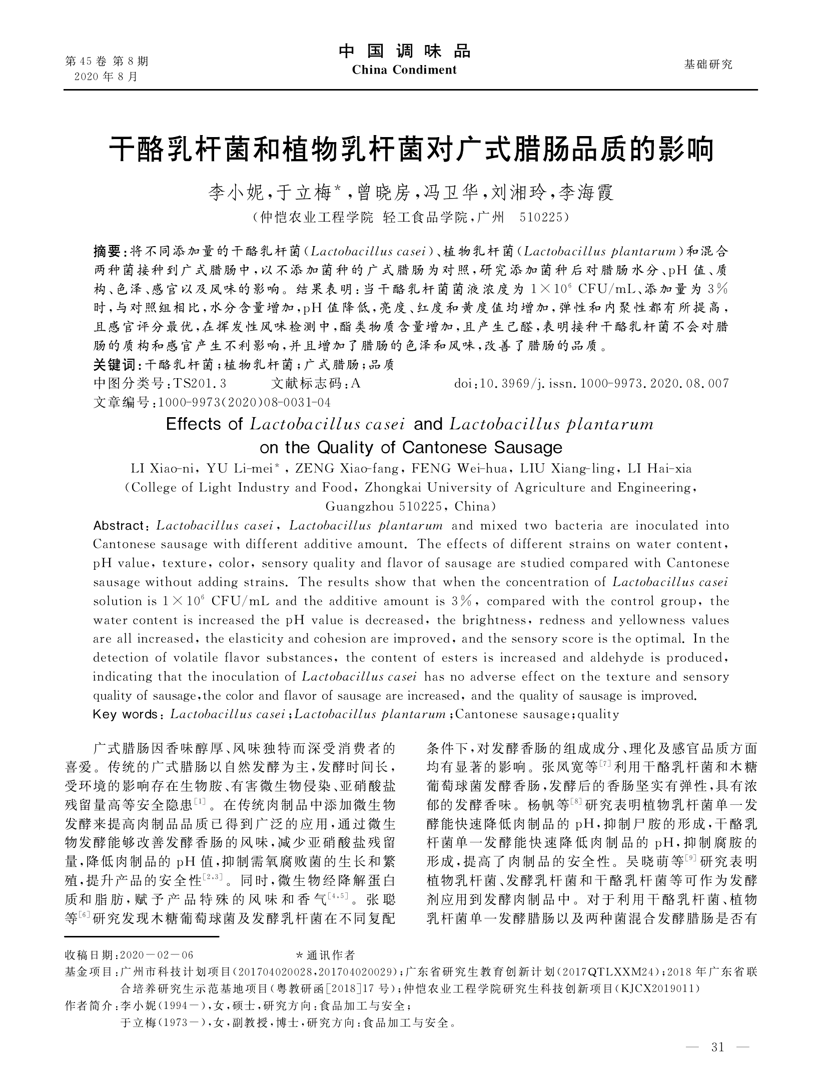 2020年,国内期刊《中国调味品》在线发表了仲恺农业工程学院轻工食品学院研究人员题为"干酪乳杆菌和植物乳杆菌对广式腊肠品质的影响"的研究论文。在该论文中,研究人员用上海腾拔仪器科技有限公司的Rapid TA实用型国产质构仪测定腊肠的硬度、弹性、咀嚼性和内聚性等指标。