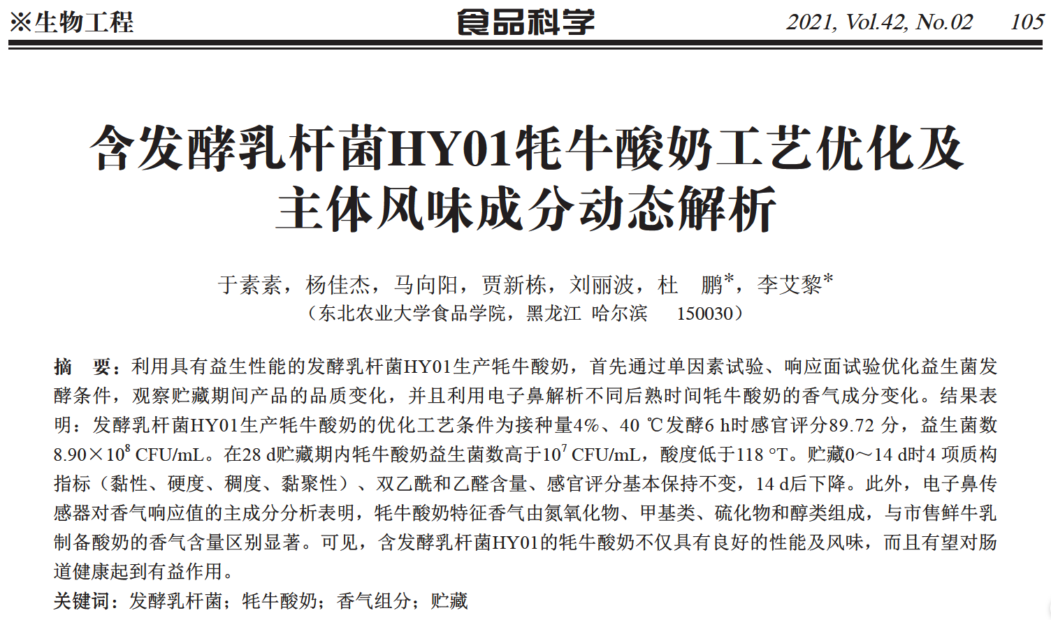 摘要:利用具有益生性能的发酵乳杆菌HY01生产牦牛酸奶,首先通过单因素试验、响应面试验优化益生菌发酵条件,观察贮藏期间产品的品质变化,并且利用电子鼻解析不同后熟时间牦牛酸奶的香气成分变化。结果表明:发酵乳杆菌HY01生产牦牛酸奶的优化工艺条件为接种量4%、40 ℃发酵6 h时感官评分89.72 分,益生菌数8.90×108 CFU/mL。在28 d贮藏期内牦牛酸奶益生菌数高于107 CFU/mL,酸度低于118 °T。贮藏0~14 d时4 项质构指标(黏性、硬度、稠度、黏聚性)、双乙酰和乙醛含量、感官评分基本保持不变,14 d后下降。此外,电子鼻传感器对香气响应值的主成分分析表明,牦牛酸奶特征香气由氮氧化物、甲基类、硫化物和醇类组成,与市售鲜牛乳制备酸奶的香气含量区别显著。可见,含发酵乳杆菌HY01的牦牛酸奶不仅具有良好的性能及风味,而且有望对肠道健康起到有益作用。