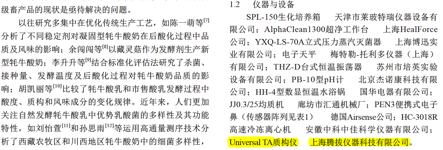 2021年,东北农业大学食品学院研究人员在国内食品期刊《食品科学》在线发表了题为“含发酵乳杆菌HY01牦牛酸奶工艺优化及主体风味成分动态解析”的研究文章。在该论文中,研究人员使用上海腾拔仪器科技有限公司的Universal TA质构仪来测定牦牛酸奶的硬度、稠度、内聚性和粘性指标。