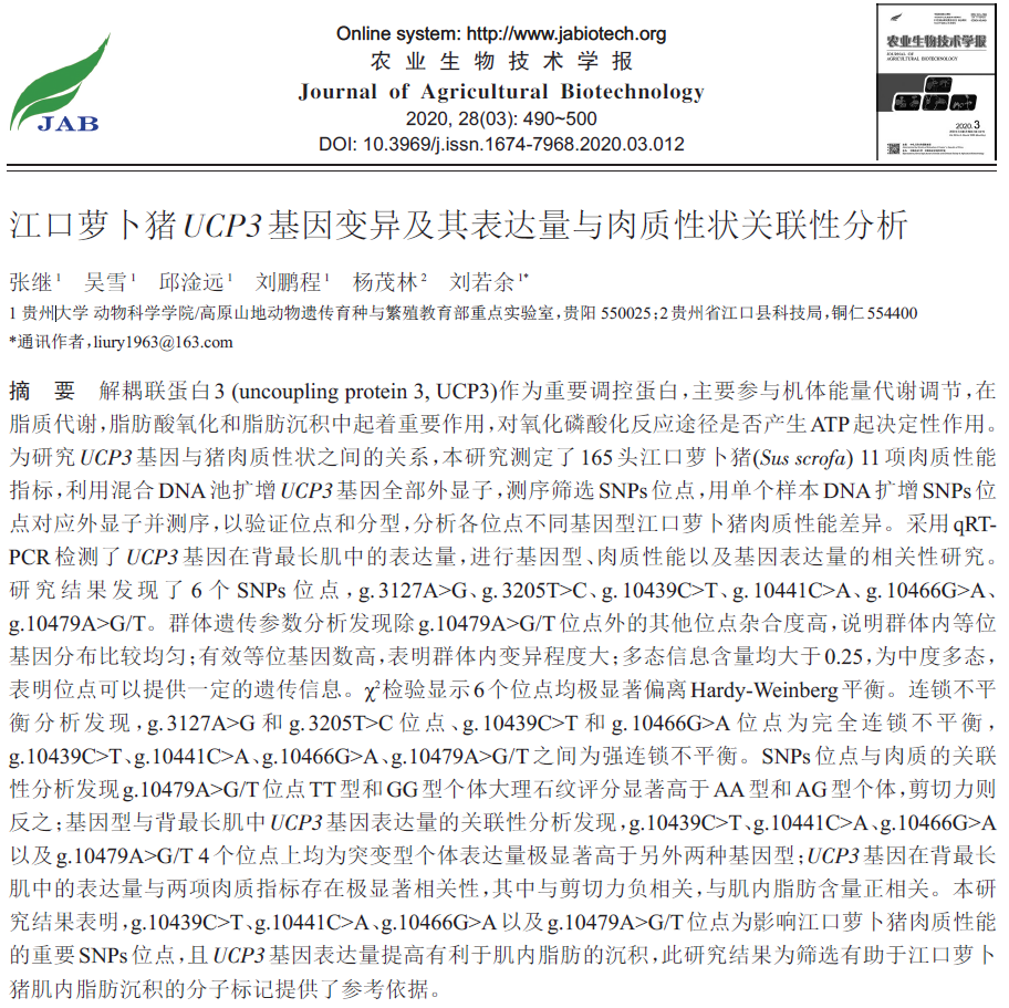 全文下载链接:江口萝卜猪UCP3 基因变异及其表达量与肉质性状关联性分析