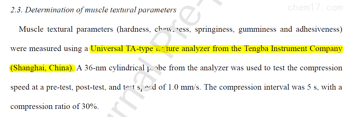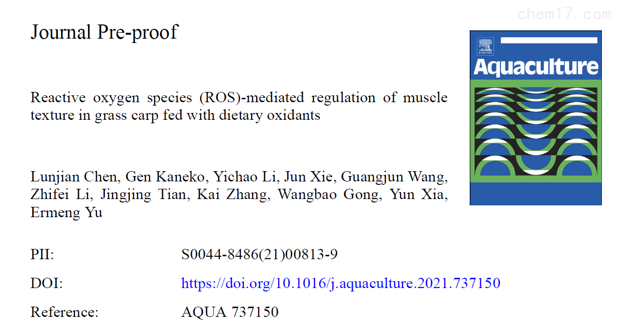 近日,中国水产科学研究院珠江水产研究所在农林科学领域TOP期刊《Aquaculture》(IF=4.242)在线发表了题为“Reactive oxygen species (ROS)-mediated regulation of muscle texture in grass carp fed with dietary oxidants"的研究论文,在该研究论文中,研究人员利用上海腾拔Universal TA研究型质构仪测定草鱼的硬度、弹性、咀嚼性和粘附性等指标。这是上海腾拔质构仪助力珠江水产研究所在国际期刊《Aquaculture》、《Food Chemistry》和《Foods》发表论文后,再次助力珠江水产研究所在国际期刊《Aquaculture》发表论文。