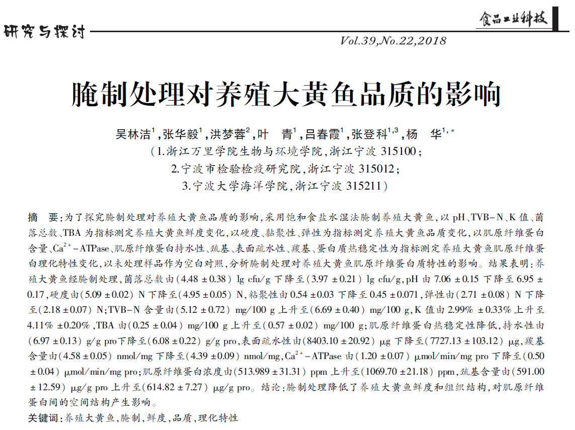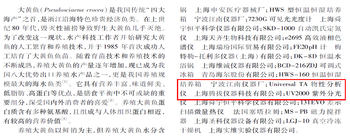 浙江*学院生物与环境学院在国内期刊《食品工业科技》发表了题为“腌制处理对养殖大黄鱼品质的影响"的研究论文。在该论文中,研究人员用上海腾拔Universal TA质构仪测定腌制大黄鱼鱼肉的硬度、弹性和黏聚性等指标。