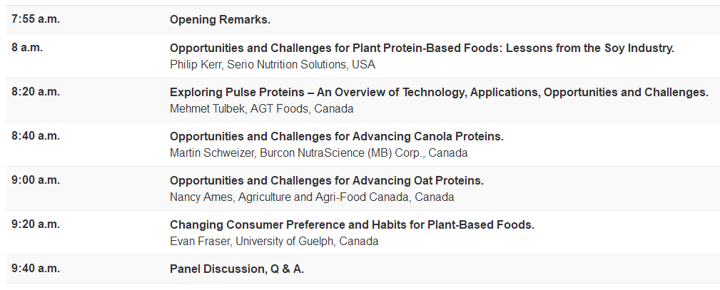 Consumers are demanding foods with higher contents of quality protein, particularly plant-based proteins. For decades, soy has been positioned as the primary plant-based protein, however consumers, and therefore industry, are seeking additional options. This Hot Topic Symposium will provide an opportunity to discuss the processes whereby soy established the primary market position for plant-based proteins and the lessons learned, followed by 3 presenting the challenges and opportunities for the introduction of alternative proteins, including those derived from canola, pulses and cereals. The session will conclude with a discussion of how changing consumer habits have affected the demand and acceptance of plant protein-based food.